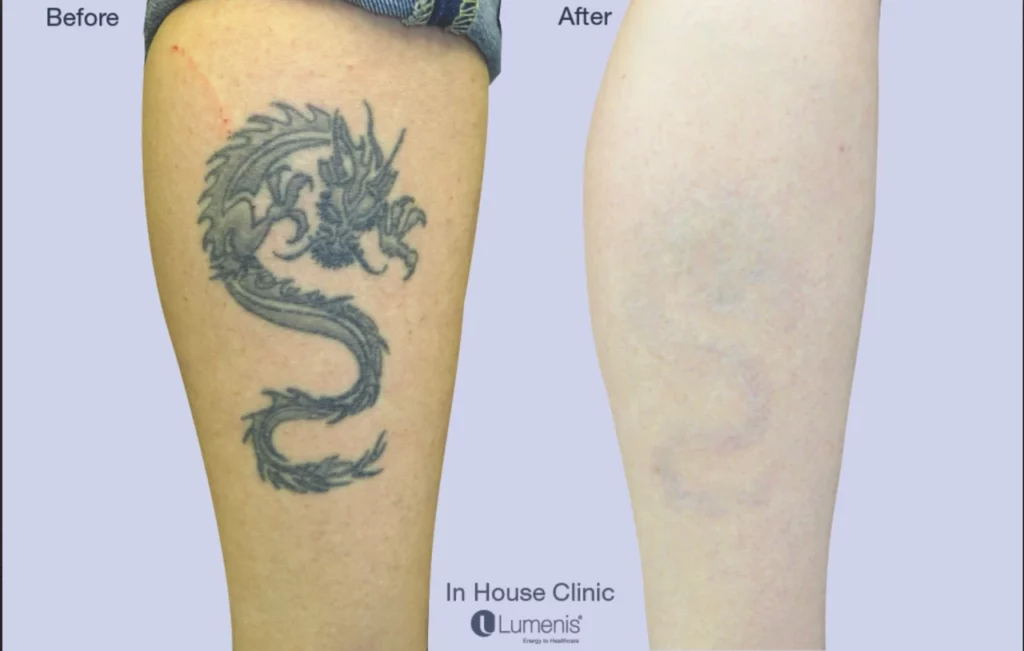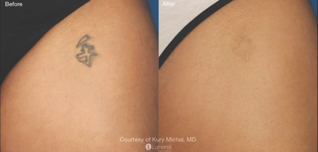 Les encres de tatouage sont constituées de particules colorées solides, qui peuvent être ciblées et éliminées par des lasers dédiés de la même manière que les lésions pigmentaires. Pour être effacés, les tatouages peuvent nécessiter différents types de laser, en fonction du type d’encre, de la couleur et de la profondeur du tatouage. Les lasers Q-Switch libèrent des impulsions très puissantes et de très courte durée. La diffusion de chaleur intense et rapide induite par l’absorption de la lumière produit un effet photo-thermique. Lorsque le chromophore est chauffé, il subit une expansion thermique soudaine qui génère des ondes de chocs produisant un bruit sec à chaque impulsion laser. Cet effet photoacoustique génère des forces qui permettent de fragmenter les particules de pigment de tatouage. Le pigment ainsi traité devient progressivement moins épais au fil du temps, jusqu’à ce qu’il s’estompe. Les tissus périphériques ne sont pas altérés, ce qui rend le traitement sélectif et sûr.